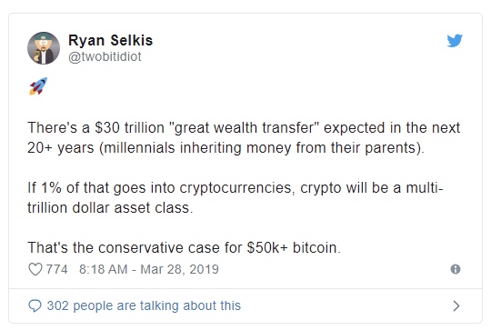 Selkis used this demographic fact to his advantage, recently writing on Twitter that as millennials en-masse inherit $30 trillion from their baby boomer parents over the coming decades, much of the money could find its way into digital assets, meant for the Information Age that society currently resides in.